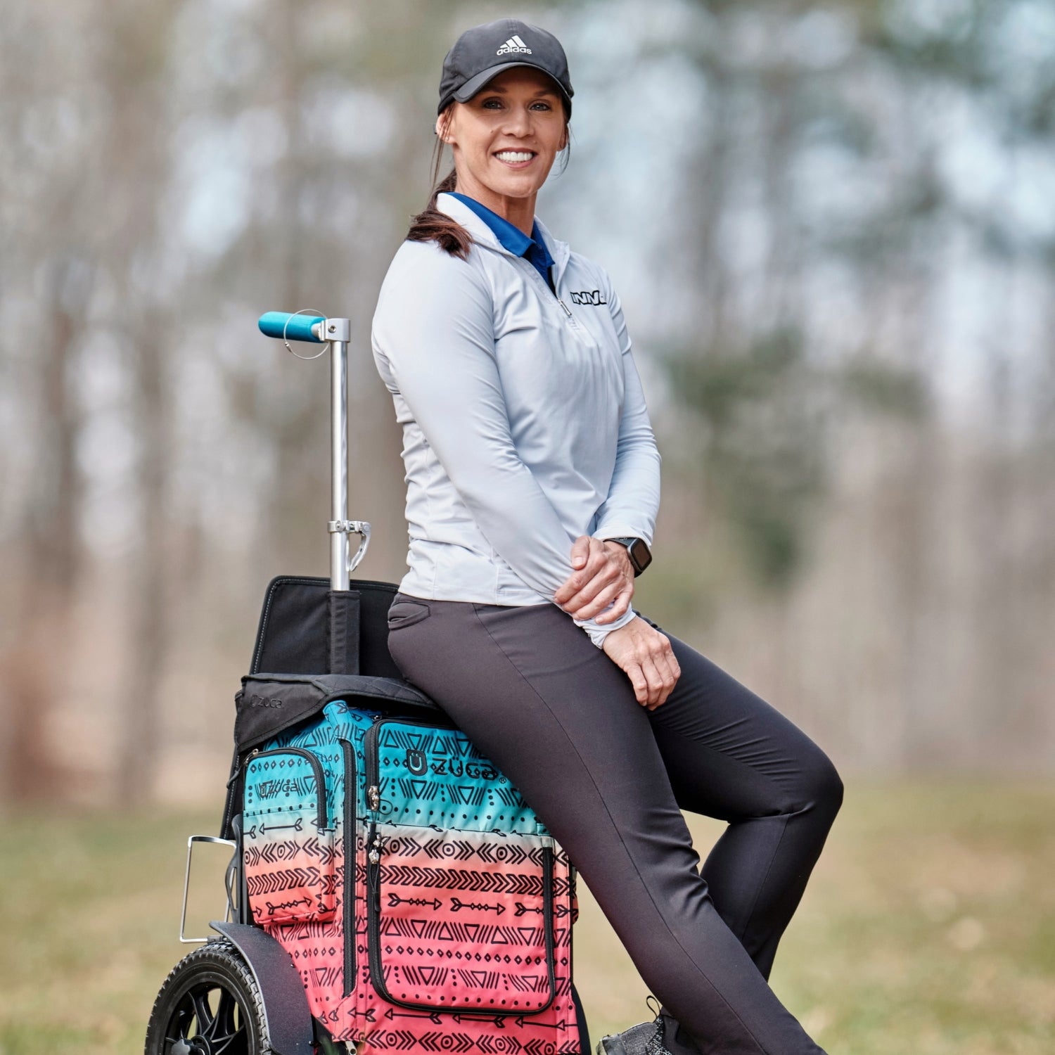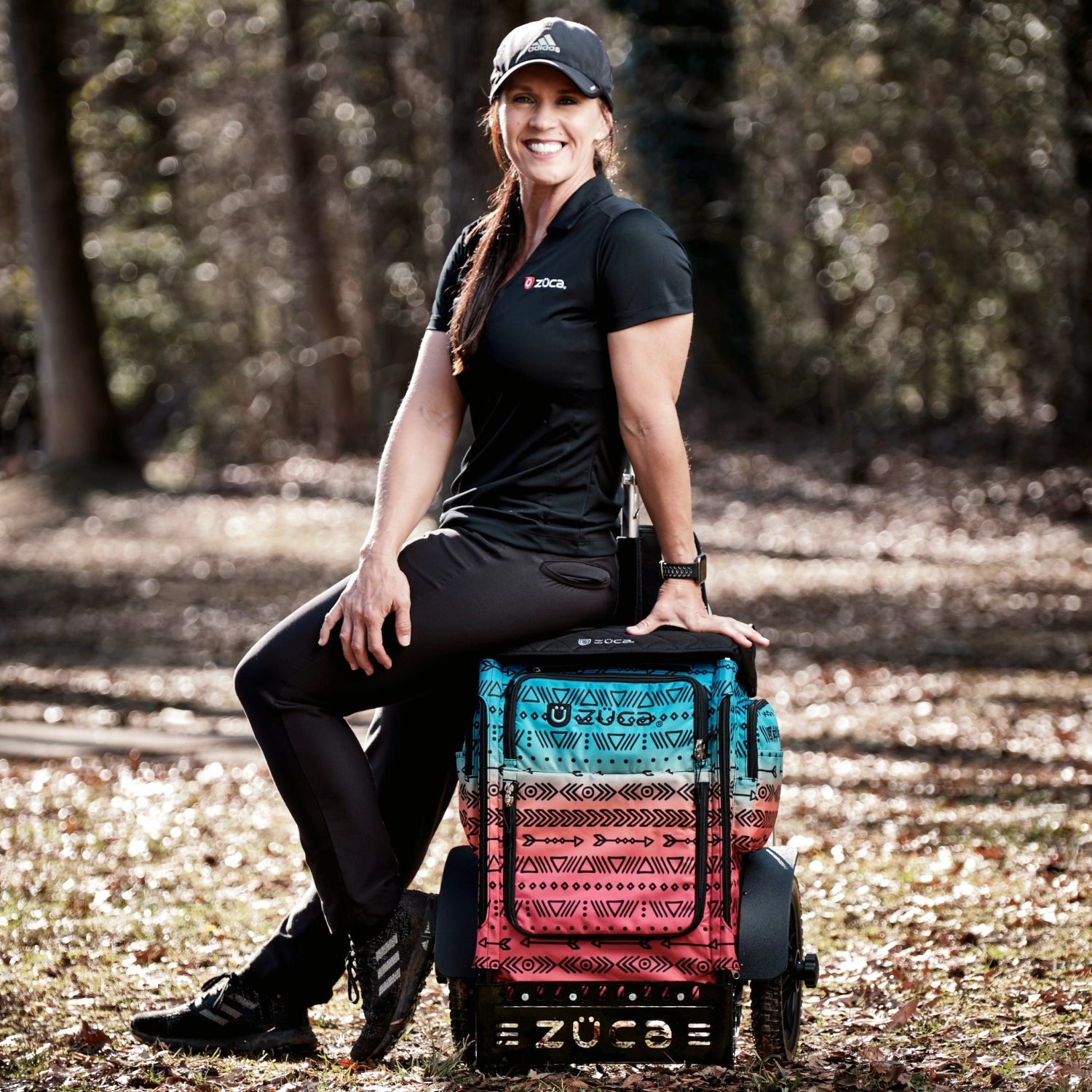 Experience disc golf in style with the ZÜCA Jennifer Allen Trekker Disc Golf Cart, featuring a captivating and colorful tribal pattern. Upgrade your gear and play every round in style with this unique and functional cart. This fully integrated design is equipped with a durable frame, built-in seat, foam tires, and a replaceable Insert Bag with multi-functional storage. Easily carries up to 25 discs and anything else you need on the course.